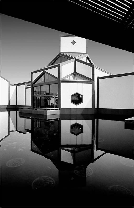 其實(shí)我們都上了貝聿銘的當(dāng),貝聿銘不是要做小、要做矮,而是他要在有限的空間里做大、做高。貝聿銘使用了中國(guó)園林中的許多技巧,其中就使用了“借景”。