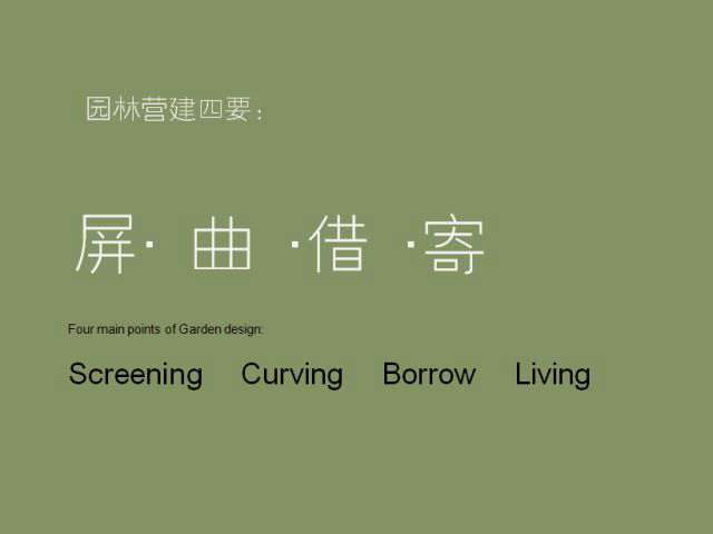下面我簡(jiǎn)單講一下蘇州園林的一些手法,四個(gè)字——屏、取、借、寄。?
