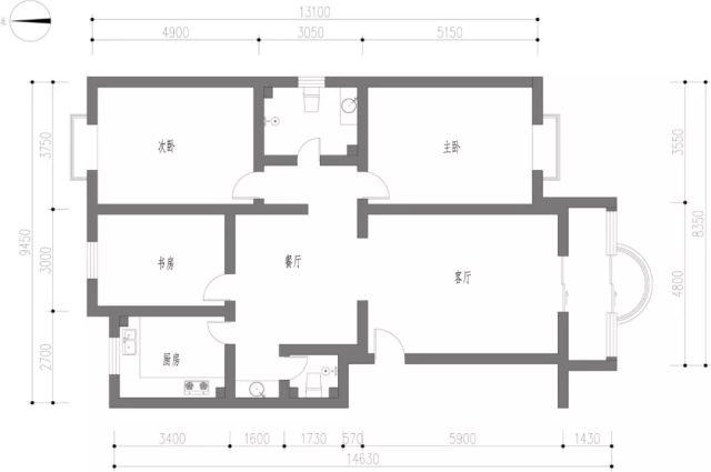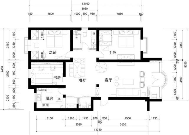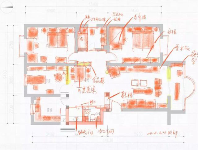 客廳利用原隔墻增加了儲物柜,可作鞋柜。餐廳利用原隔墻增加了食品柜,可放置酒、茶餅、工藝品等。增加了儲藏室,雜物收入儲藏室。次臥設置集中衣柜、書桌,解決兒子衣服收儲。主臥在保留原衣柜基礎上,增加了衣帽間,解決夫婦倆衣服收儲。
