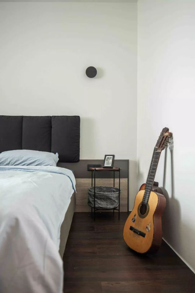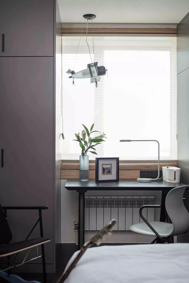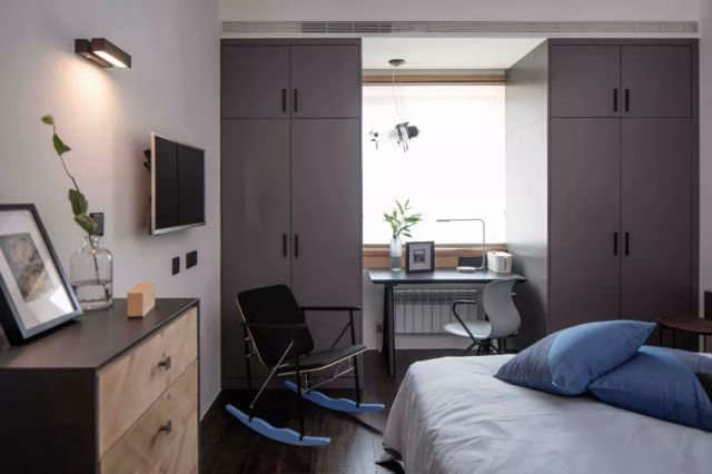 次臥為徐立平兒子居住。他繼承了徐家的優秀品質,自小成績優異,現在更是學業有成。不僅如此,具有男子漢氣概的學霸很注重時尚。次臥除了設置集中衣柜和書桌,解決衣物與書籍收儲。從家具以及物品的選配上,還增加了酷元素。
