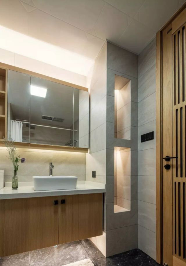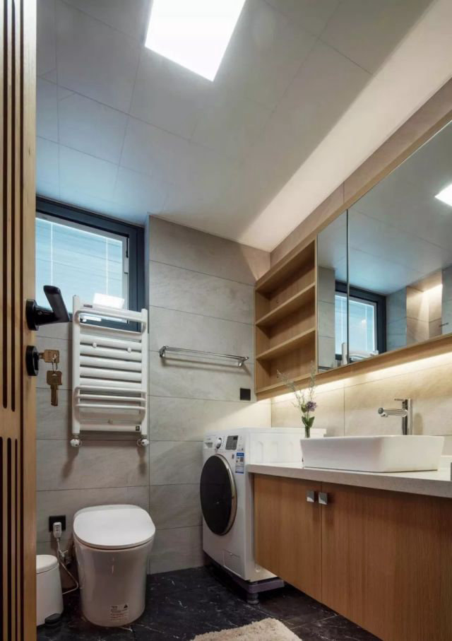主衛使用隱藏式水箱馬桶,節約空間,增加臺面及儲藏空間;浴簾式淋浴間,節約空間,淋浴間增設晾衣繩,延續原有主人使用習慣,同時也做到了干濕分離。