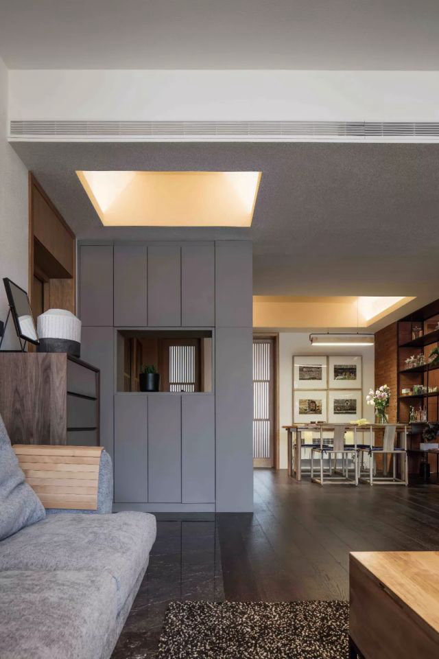 在整個設計中,貫穿了一個理念—“自然的力量”。原屋的暖氣片熱氣流會揚起灰塵,所以在局部吊頂中安置了隱藏式的新風凈化機,使空氣內外循環,提高環境空氣質量。